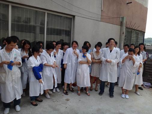 下午2点10分,在总指挥张彬书记的口令下,质量管理部2012年度消防安全演练拉开了序幕。顿时,化验室内升起滚滚浓烟,警铃大作,“火势汹涌,无法控制”,质管部立即启动紧急疏散预案,疏散所有员工。只见,所有员工手拿毛巾湿布捂住口鼻,弯腰靠边,从消防楼梯有序“逃”跑。安全环保部王医生带着药箱,随时准备抢救受伤的员工。经测算,从火警开始到最后一位员工撤离,总共用时3分钟。