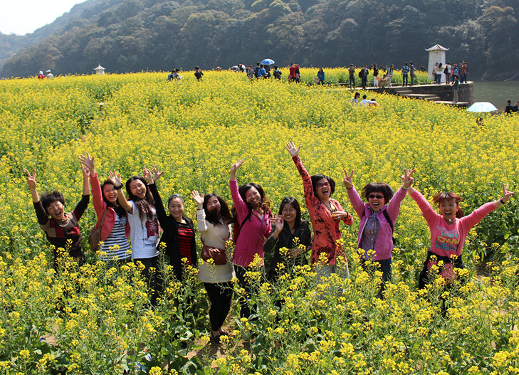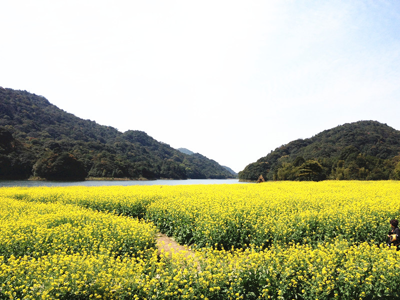 凭栏眺望,上百亩的油菜花田,绵延不断。微风吹过,漫天遍野的油菜花摇曳生姿,淡淡的花香在鼻尖萦绕不散。阳光下,湖面波涛折射出一个个梦幻的圆圈,给人们带来心灵的安宁和平静。不远处,山谷林立,翠色葱葱,在蓝天的映衬下,相得益彰。花田里,游人如织,或与蜜蜂嬉戏,或与蝴蝶起舞,构成了一幅心旷神怡的田园风光。