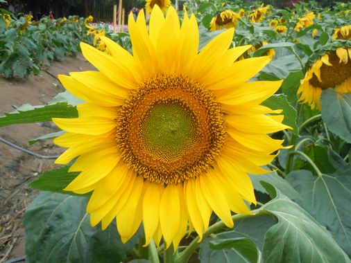 园内盛开的百万朵向日葵,追随着太阳竞相怒放,它以鲜艳夺目的黄色花瓣和挺拔的身躯以及高昂的脸盘、向上的情感,向我们传递着健康、茁壮,朵朵的葵花是追求光明和幸福的象征……