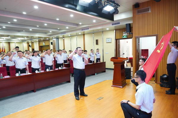 大会在庄严的国歌声中拉开了序幕。在党委书记许镇江的带领下,全体党员起立,面向党旗,举起右手,庄严宣誓,重温了入党誓词。